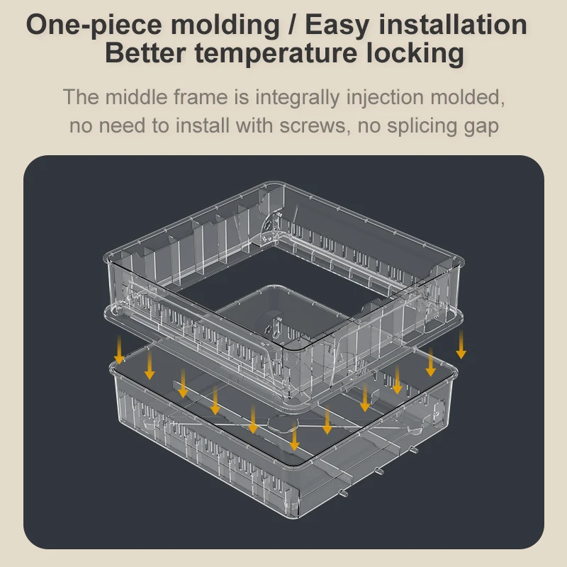 1. One-piece molding and temperature locking is not complicated: the middle frame is injected integrally, so it is not required to be installed like the old screws, and there is no splicing gap, which is convenient to use and has a good temperature locking effect.